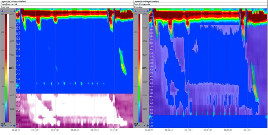 Abb. 1: High-Resolution-Manometrie mit Impedanz in getrennter (links) und überlagerter (rechts) Darstellung beim Schlucken von kohlesäurehaltigem Mineralwasser. Niedrige Impedanz (violett) entspricht Flüssigkeiten, hohe Impedanz (weiß/transparent) entspricht Gas. Es zeigt sich eine hohe Impedanz unterhalb des oberen Ösophagussphinkters nach dem Schluck mit einer fehlenden Öffnung des oberen Ösophagussphinkters, welche erst durch einen erneuten Schluck mit regelhafter Öffnung der Ösophagussphinkter abfällt