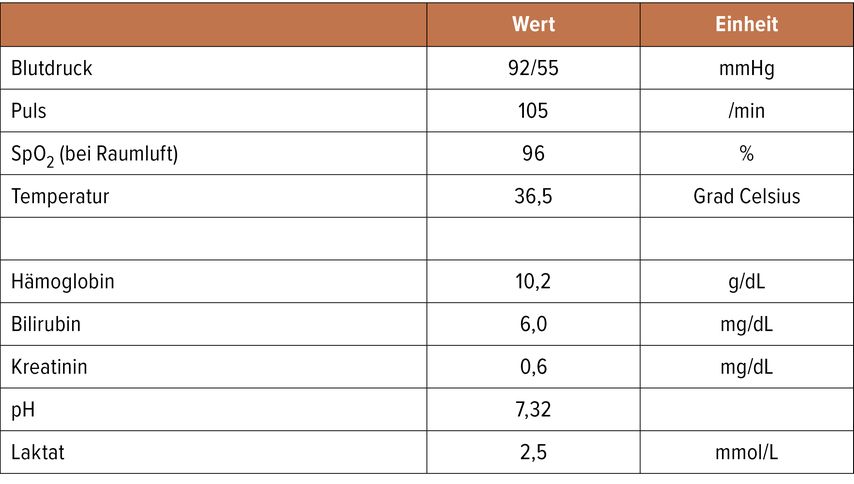 Es präsentiert sich gegen 23.30 Uhr ein 54-jähriger, wacher, nicht ganz orientiert wirkender Mann in der Notfallaufnahme (Vitalparameter und venöse Blutgasanalyse [BGA] siehe Tab.1). In der (verbesserungswürdigen) Dokumentation des letzten verfügbaren Entlassungsbriefs von vor 9 Monaten finden sich folgende Diagnosen: Leberzirrhose Child A, Status post (St.p.) Varizenblutung, art. Hypertonie; und folgende Medikamente: Carvedilol 12,5mg 1x/Tag, Laevolac 1–2x/Tag, Spironolacton 200mg 1x/Tag. Insgesamt wird von einer Leberzirrhose mind. Child B (9) (Bilirubin >3mg/dL, Aszites mind. Grad 1, hepatische Enzephalopathie mind. Grad 2) mit Verdacht auf (Vd.a.) eine Varizenblutung ausgegangen. Nach i.v. Volumenersatz, Ceftriaxon, vasoaktiver Medikation und i.v. Gabe eines Protonenpumpenhemmers entscheiden wir uns für eine Gastroskopie in Sedierung. Im Ösophagus sehen wir bereits eine aktiv blutende Ösophagusvarize im distalen Drittel. Nun wird versucht, die Varize einzusaugen, was jedoch aufgrund von Vernarbung nicht gelingt – ein unangenehmes Szenario. Was nun?