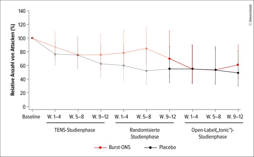 Phase eins umfasste eine vierwöchige Baseline mit anschließender transkutaner elektrischer Nervenstimulation (TENS) über zwölf Wochen hinweg für beide Gruppen. TENS reduzierte Clusterkopfschmerzattacken im Median um 4,7 in beiden Behandlungsarmen. Etwa 34% der Teilnehmer:innen erzielten bereits eine 30-prozentige Ansprechrate.13