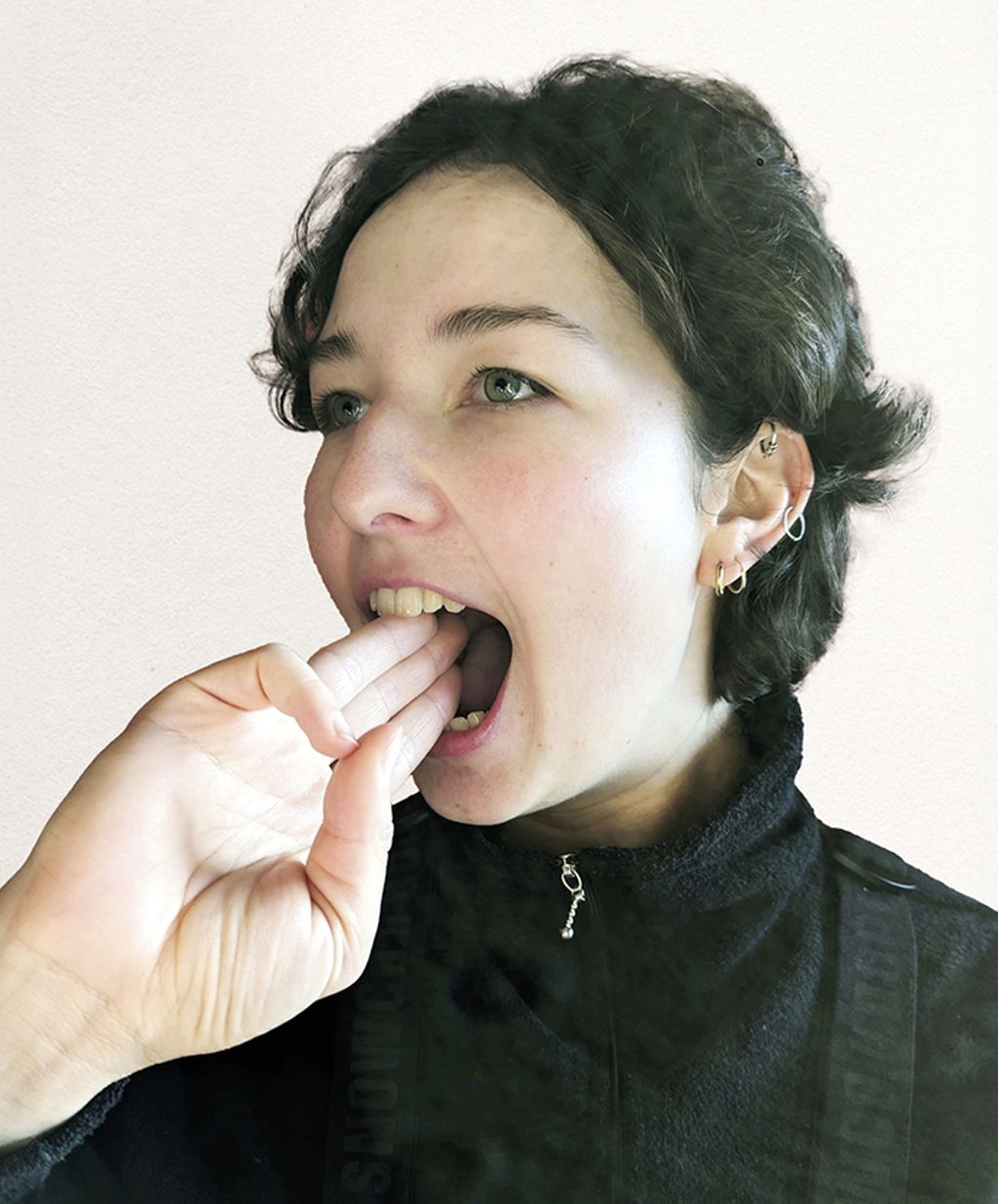 Abb. 3: Isometrische Dehnung der Kaumuskulatur: Zeige- und Mittelfinger auf die unteren Schneidezähne legen. Mund öffnen, ausatmen, Luft anhalten. Mit den Fingern Kiefer leicht nach unten drücken, dabei Kiefer mit wenig Kraft dagegendrücken. Einatmen, Luft anhalten, dabei Kiefer entspannen und Kiefer weiter nach unten ziehen