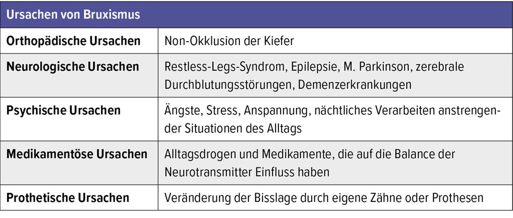 Bruxismus ist ein komplexes medizinisches Phänomen, das nicht auf eine Handvoll Ursachen reduziert werden kann (Tab.1). Seine Ursachen setzen sich aus dem individuellen Befinden, dem Lebensstil und dem Umfeld des Betroffenen zusammen. Bruxismus gilt als eines der ersten Symptome von Kiefergelenkserkrankungen.