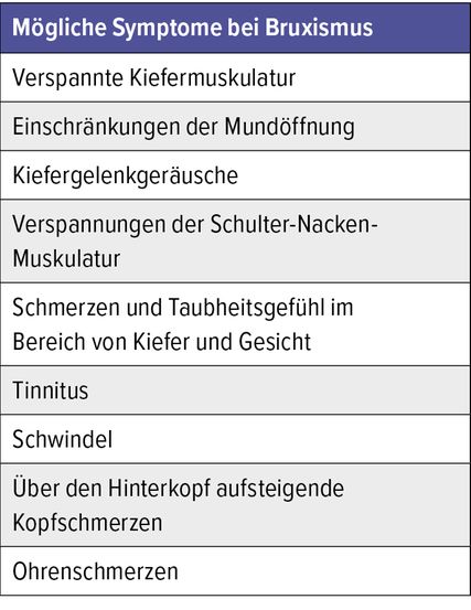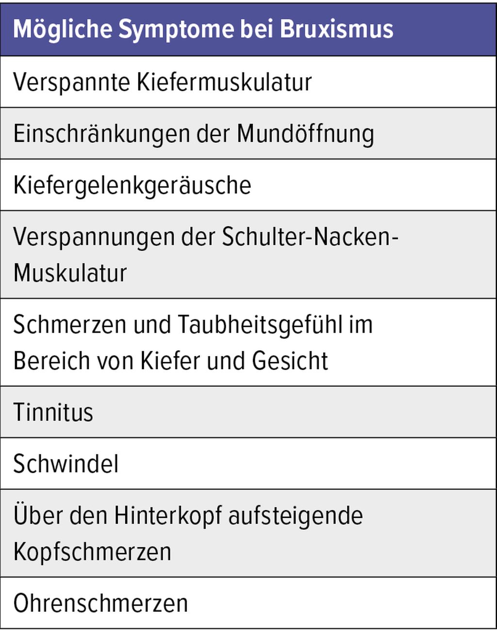 Bruxismus ist ein Frühsymptom einer Dysfunktion des kraniomandibulären Systems. Der Begriff «System» soll unterstreichen, dass es sich um eine Störung handelt, die den Kauapparat im komplexen Zusammenwirken mit seinem umgebenden System, dem Muskel-Faszien-Apparat, den Kopfgelenken und der Halswirbelsäule betrifft. Daher sind auch die Symptome vielschichtig. Die häufigsten Symptome sind Kopfschmerzen, Kiefergelenkgeräusche, Einschränkungen der Mundöffnung, zudem Verspannungen der Schulter-Nacken-Muskulatur und Schmerzen im Bereich von Kiefer und Gesicht, Tinnitus und Schwindel (Tab. 2).